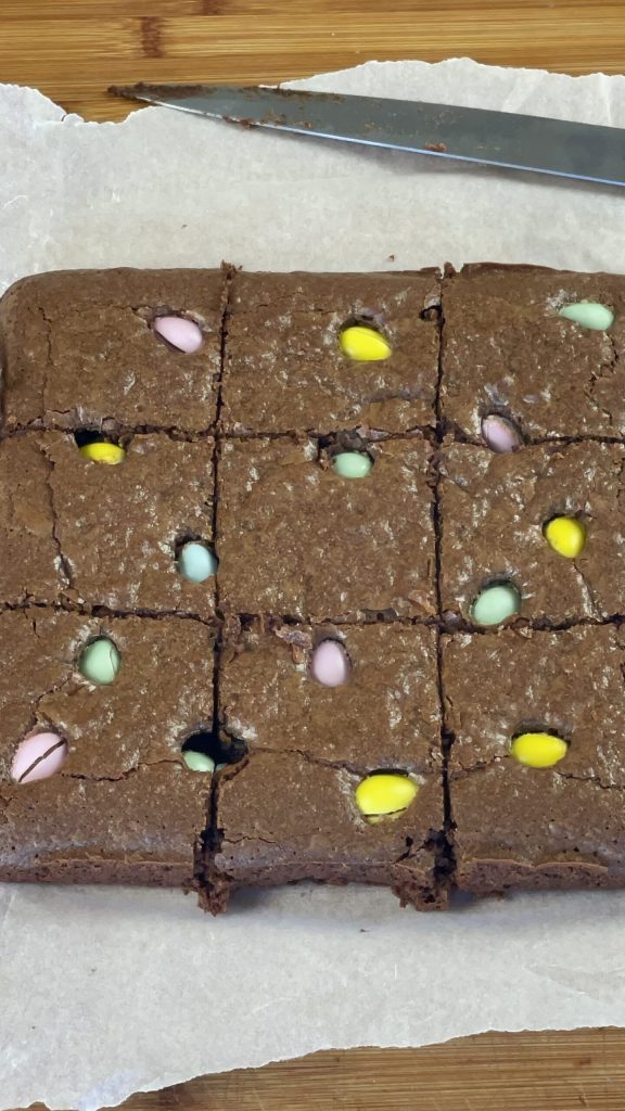 Beginne die Zubereitung des Brownie-Desserts mit Eiern zu Ostern, indem du die Brownies zubereitest.