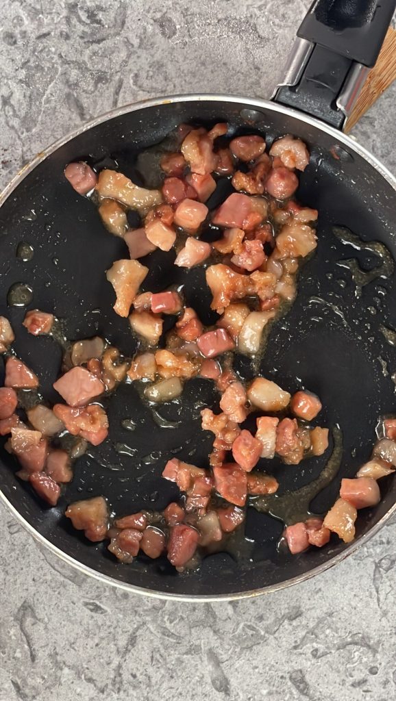 Beginne die Zubereitung der Bruschetta mit Pilzen und knusprigem Speck genau mit letzterem. Erhitze eine beschichtete Pfanne auf dem Herd, ohne weitere Fette hinzuzufügen. Wenn sie heiß ist, füge den Speck hinzu und lasse ihn für ein paar Minuten bräunen. Füge auch den Honig hinzu und koche weitere 3-5 Minuten oder bis der Speck goldbraun und knusprig ist.