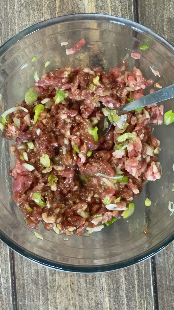 Füge ihn dem Fleisch hinzu und mische, bis er vollständig mit den anderen Zutaten vermischt ist.