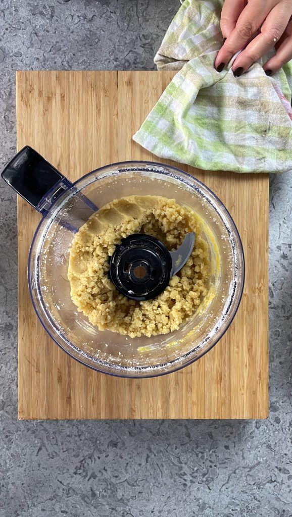 Mische auf höchster Stufe, bis der Mürbeteig anfängt, sich zu verbinden und Krümel entstehen.