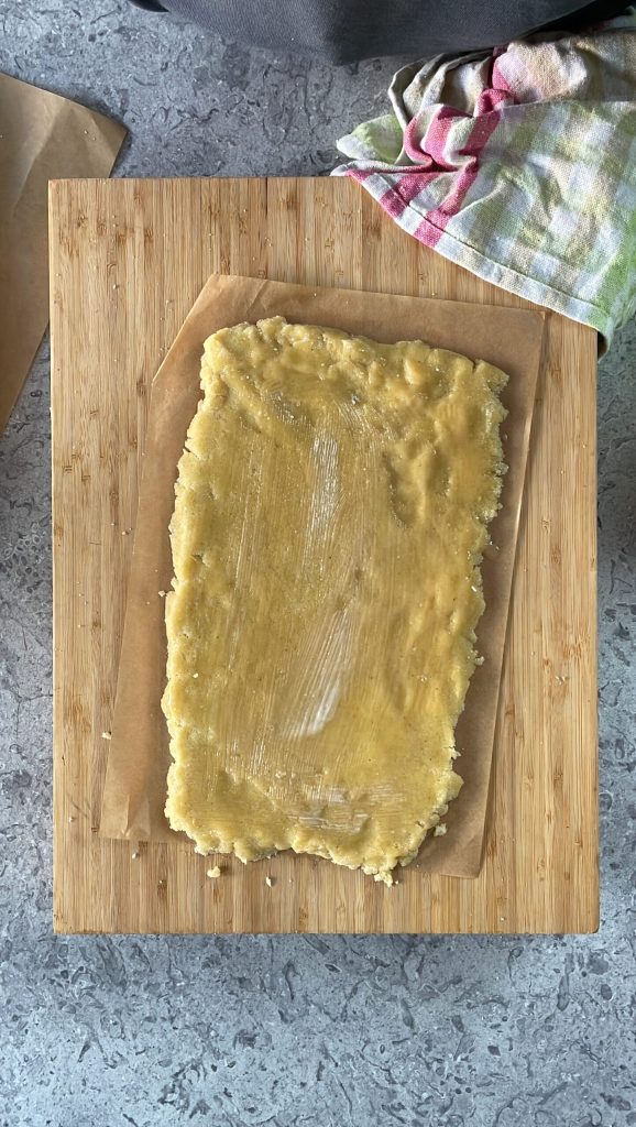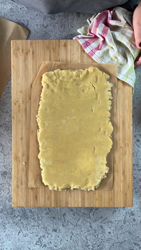 Lasse den Mürbeteig etwa eine Stunde im Kühlschrank ruhen.Nach der Ruhezeit rolle den Mürbeteig auf einem Blatt Backpapier auf eine Dicke von etwa 4-5 mm aus.