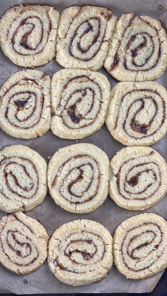 Cinnamon Roll Kekse, duftende Mürbeteigkekse, die eine süß-würzige Füllung aus braunem Zucker und Zimt enthalten, veredelt mit einem köstlichen Zuckerguss.