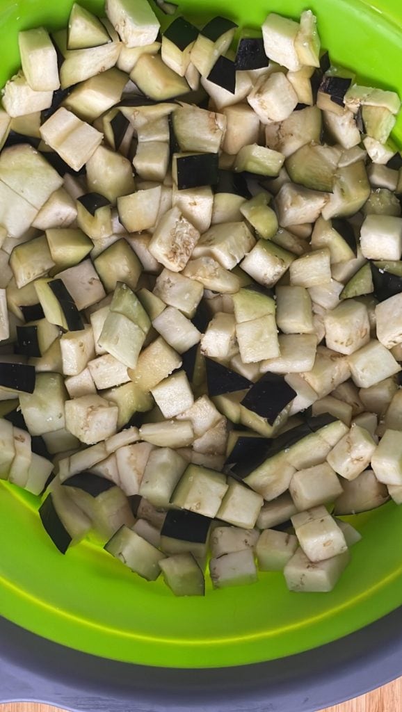 Beginnen Sie mit der Zubereitung von Couscous mit Kichererbsen und Auberginen, indem Sie die Aubergine waschen und den oberen Teil entfernen. Schneiden Sie sie zuerst in Scheiben und dann in ziemlich kleine Würfel.