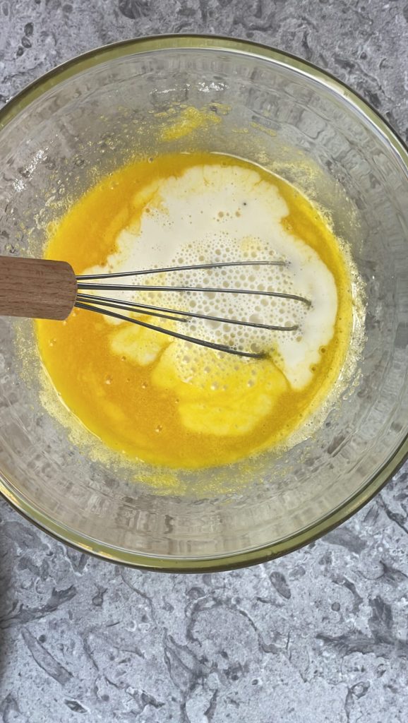 Gieße die heißen Flüssigkeiten unter ständigem Rühren in die Schüssel mit den Eigelben und dem Zucker.