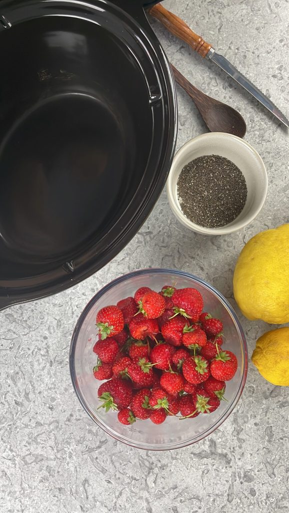 Zutaten der Erdbeermarmelade im Slow Cooker