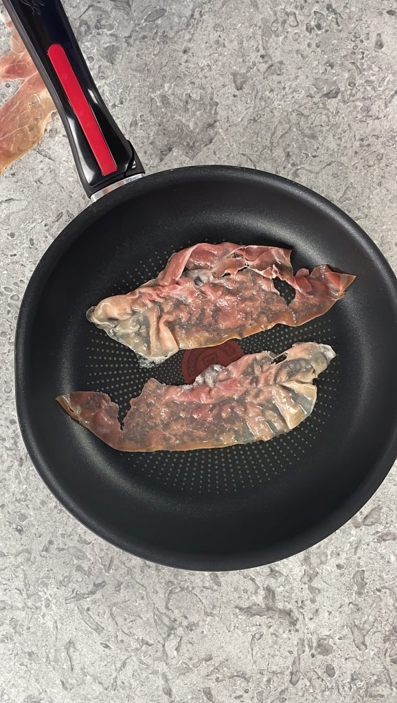 Beginne die Zubereitung des Feigen- und Schinkensalats, indem du den Schinken für wenige Sekunden in einer heißen Pfanne anbrätst.
