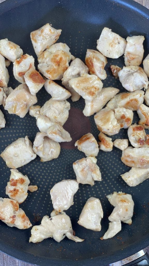 Brate das Hähnchen in einer Pfanne mit wenig nativem Olivenöl extra etwa 12-15 Minuten, gelegentlich wenden.