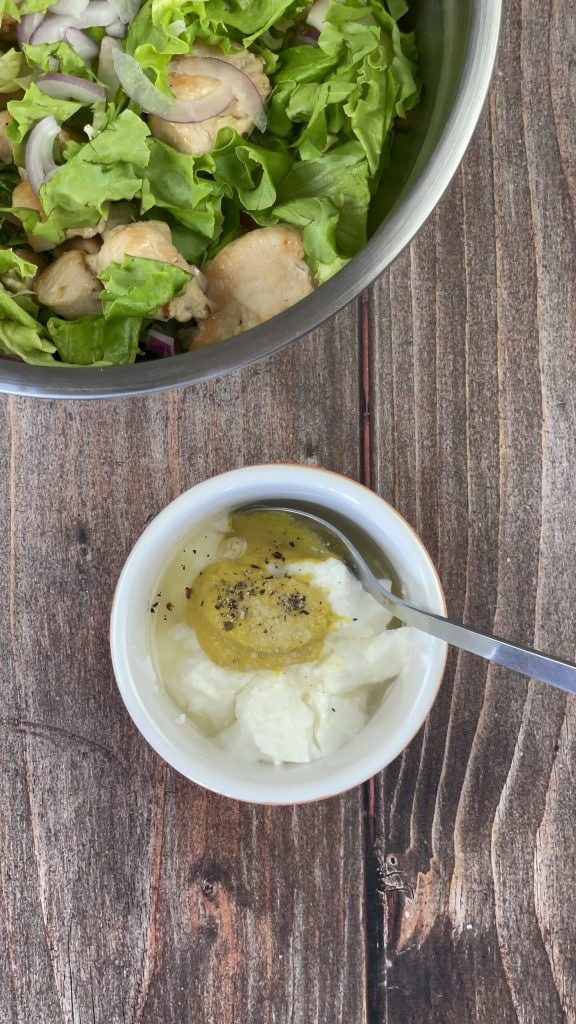 Lass das Hähnchen abkühlen und fahre mit der Rezeptzubereitung fort.Gib den griechischen Joghurt in eine kleine Schüssel.