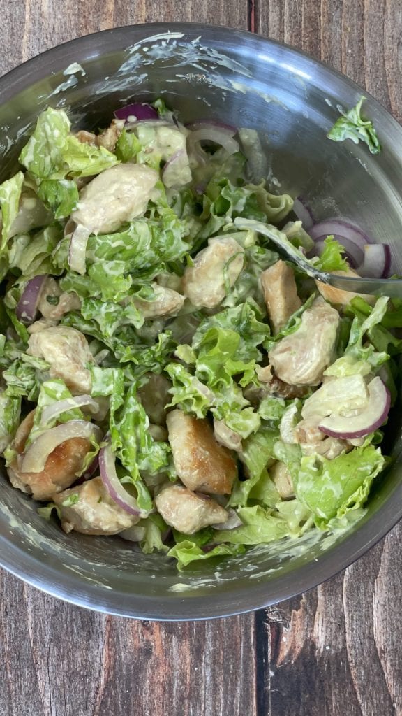 Gib sie in eine Schüssel mit dem abgekühlten Hähnchen und mische die beiden Zutaten.Wasche und trockne den Salat gut: Ich habe die Sorte Gentilina verwendet, aber auch Römersalat eignet sich hervorragend.