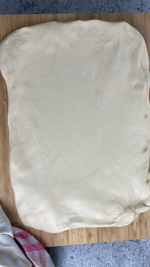 Übertrage den Teig auf ein leicht bemehltes Teigbrett und arbeite ihn von Hand für weitere 5 Minuten. Gib ihm eine runde Form und lasse ihn auf das Doppelte aufgehen.Nimm den aufgegangenen Teig und lege ihn auf ein Teigbrett.