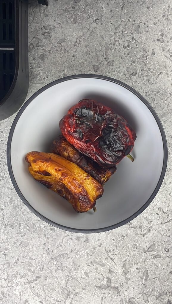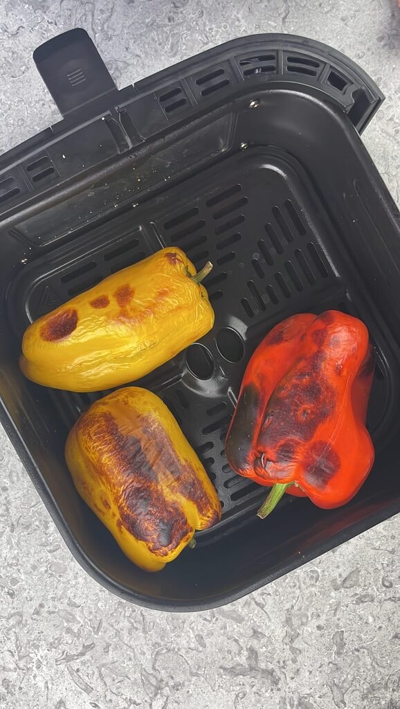Geröstete Paprika in der Heißluftfritteuse, ein einfaches, leichtes und unglaublich praktisches Sommerrezept, perfekt für alle, die vermeiden möchten, den Ofen oder Herd an den heißesten Tagen einzuschalten.
