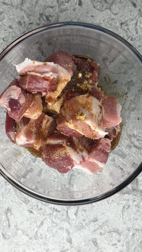 Gib zum Schweinebauch eine Knoblauchzehe, gerieben oder zerdrückt, einen Teelöffel gemahlenen Ingwer, den Rohrzucker und die Sojasauce hinzu.