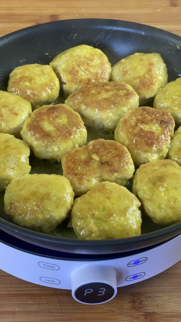 Hähnchen-Curry-Frikadellen, einfach zuzubereiten, würzig und duftend dank des Currys, das dem Hähnchenfleisch einen starken und entschiedenen Geschmack verleiht.