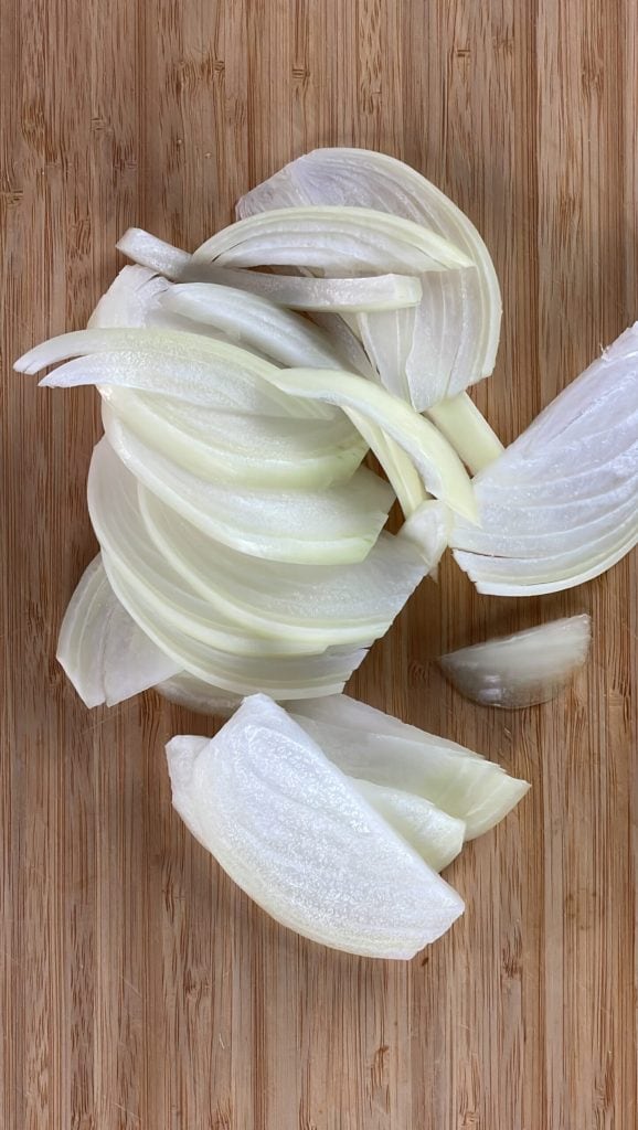• Beginne die Zubereitung des Hähnchens mit Kürbis und Curry, indem du die gelbe Zwiebel schälst und in dünne Scheiben schneidest.