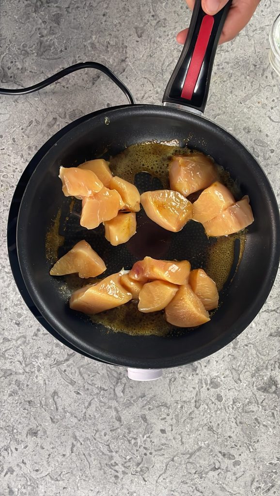 Füge auch das Hähnchen hinzu und brate es von allen Seiten gut an.