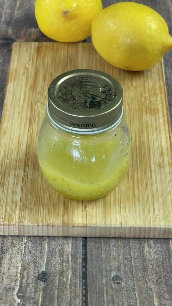 Gib das extra native Olivenöl, den Zitronensaft, den Honig, das Salz und den schwarzen Pfeffer in ein Glas.Schließe das Glas mit dem Deckel und schüttle es für ein paar Sekunden.