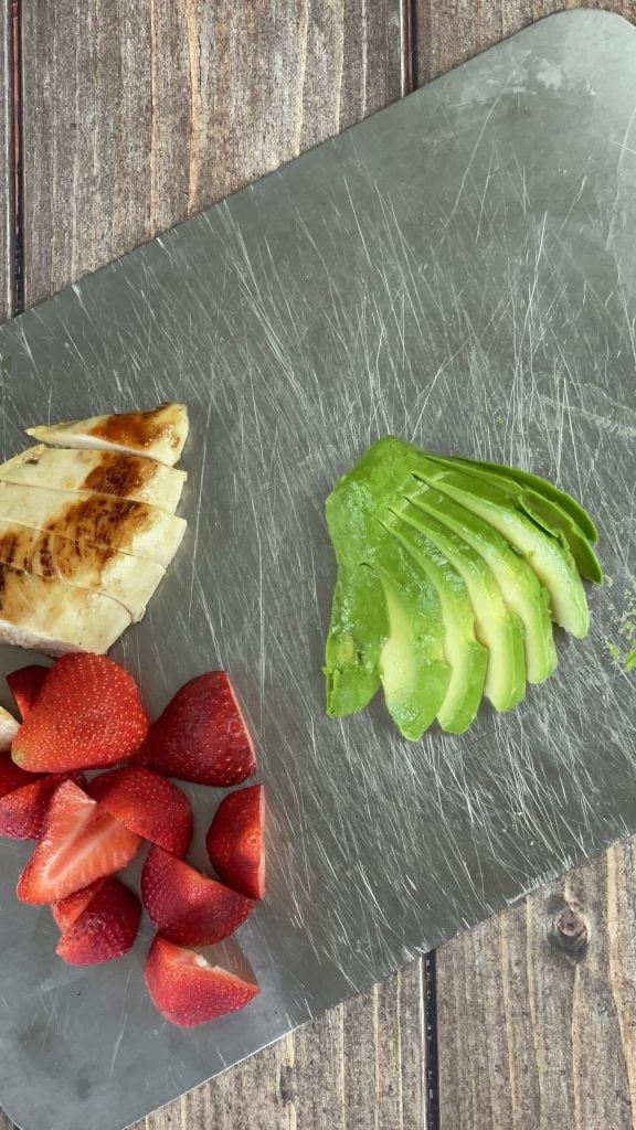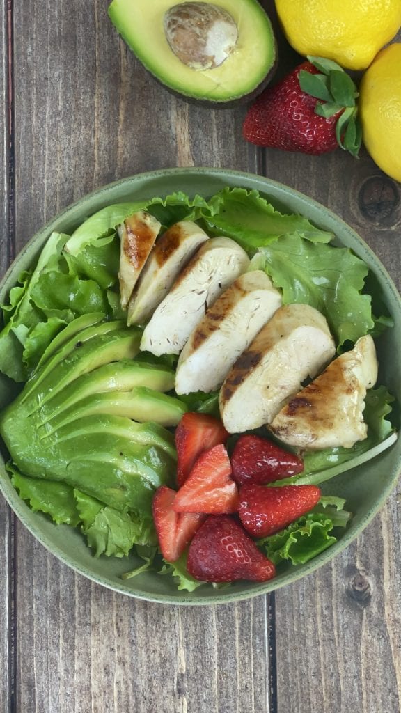 Dieser Salat ist außerdem ein ausgewogenes Gericht, da das Hähnchen Proteine liefert, die Avocado gesunde Fette und die Erdbeeren und der Lattich Ballaststoffe und Vitamin C.