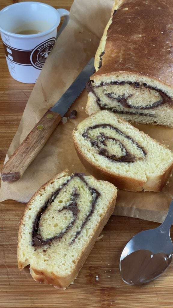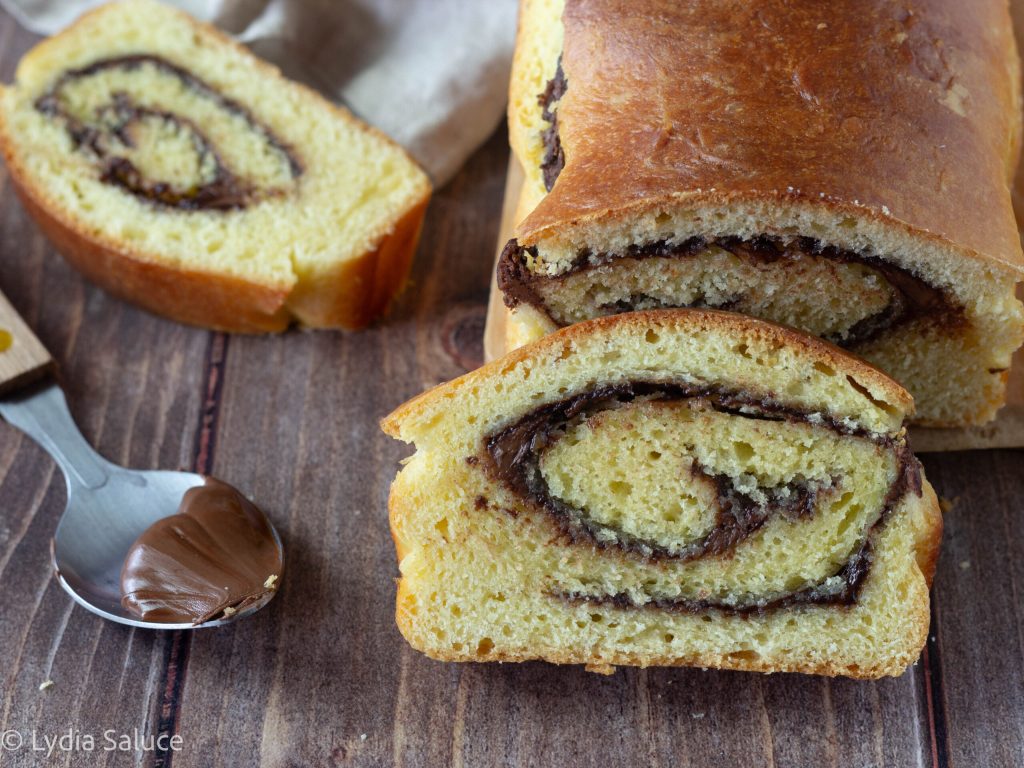 Haselnuss-Schokoladen-Rolle, ein weiches Brioche-Brot gefüllt mit Haselnuss-Schokoladen-Creme. Ein Rezept, das für die ganze Familie geeignet ist, perfekt sowohl zum Frühstück als auch zum Nachmittagskaffee.
