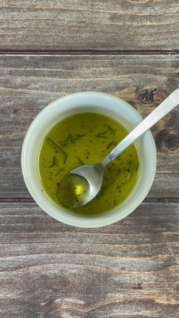 Beginne die Zubereitung der Hasselback-Kartoffeln in der Heißluftfritteuse mit dem Dressing: Wiege in einem Schälchen das extra native Olivenöl ab.