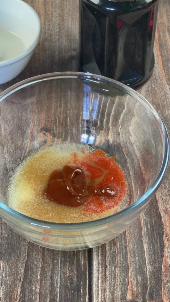 In einer größeren Schüssel gib das restliche Wasser (also 240 ml), den Reisessig, den Zucker, das Salz, das Knoblauchpulver, den Ketchup, die Sriracha und die Fischsauce.