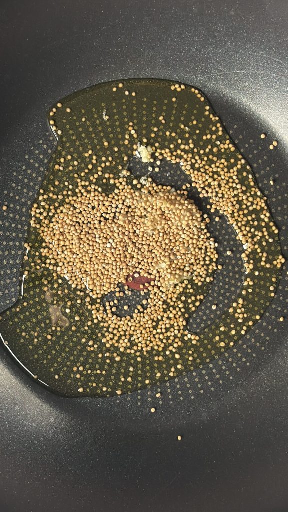Erhitze in einer Pfanne das native Olivenöl extra mit einer geriebenen Knoblauchzehe (alternativ geht auch ein Teelöffel Knoblauchpulver) und den Senfkörnern.