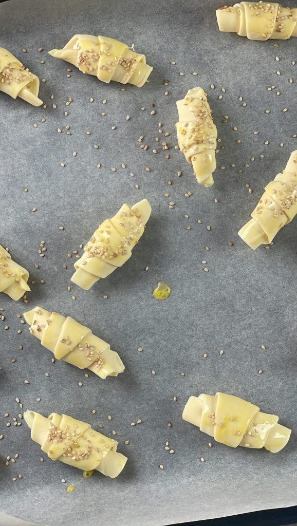 Lege die Croissants auf ein mit Backpapier ausgelegtes Blech, wobei die Naht unten auf dem Blech liegt: So besteht keine Gefahr, dass sich die Croissants während des Backens öffnen. Bestreiche die Croissants mit dem verquirlten Ei und dekoriere sie mit Sesam.