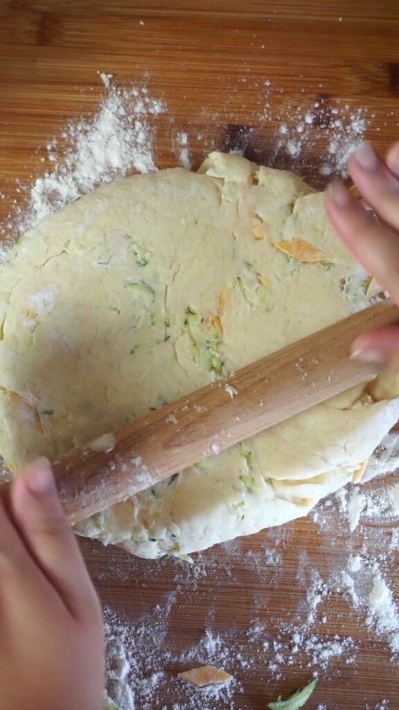 Gib den Teig auf eine bemehlte Arbeitsfläche und füge die Zucchini mit dem Cheddar hinzu.Knete mit den Händen, bis du einen homogenen, nicht klebrigen Teig erhältst.