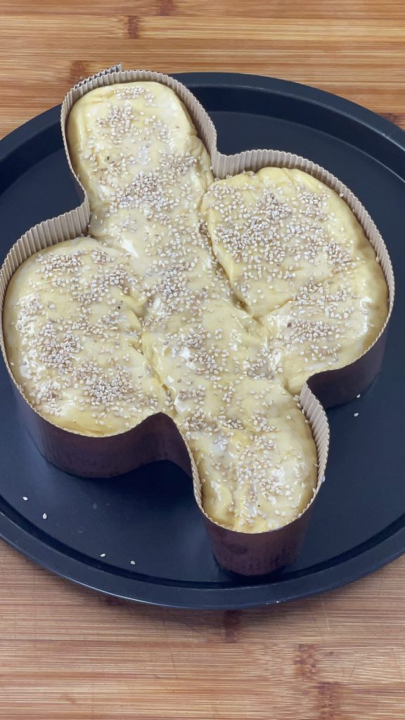 Bedecke sie erneut und lasse sie aufgehen, bis der Teig den Rand der Form erreicht hat.Nimm die aufgegangene Taube, bestreiche sie mit Milch und bestreue sie mit Sesamsamen.