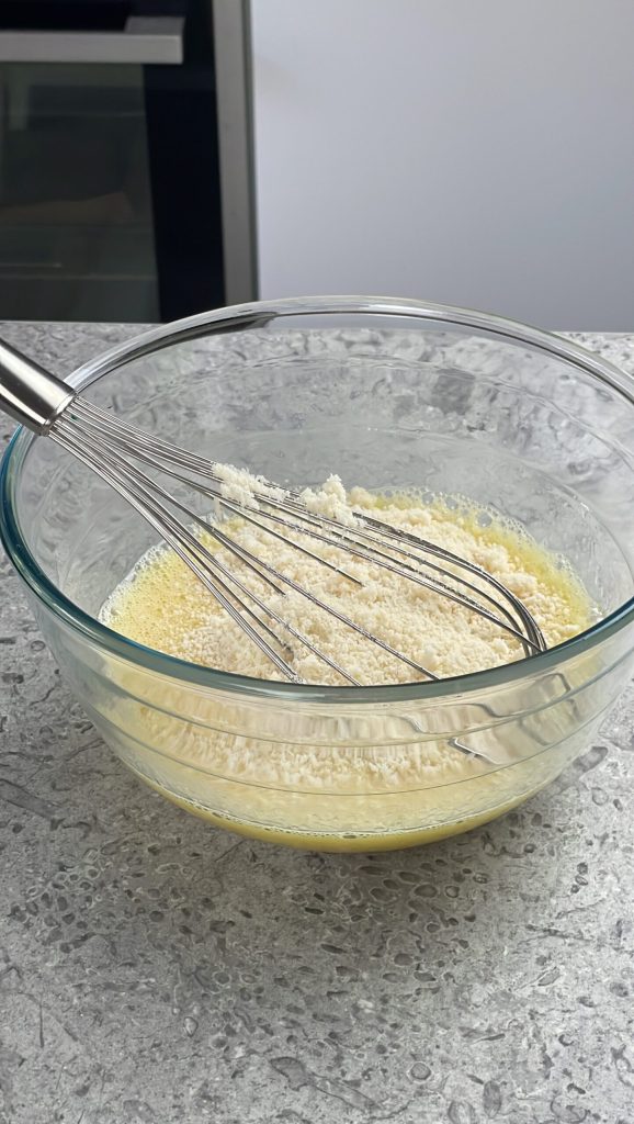 Rühre die Mischung erneut mit dem Schneebesen um.Gib den geriebenen Parmigiano Reggiano in die Schüssel mit den anderen Zutaten.