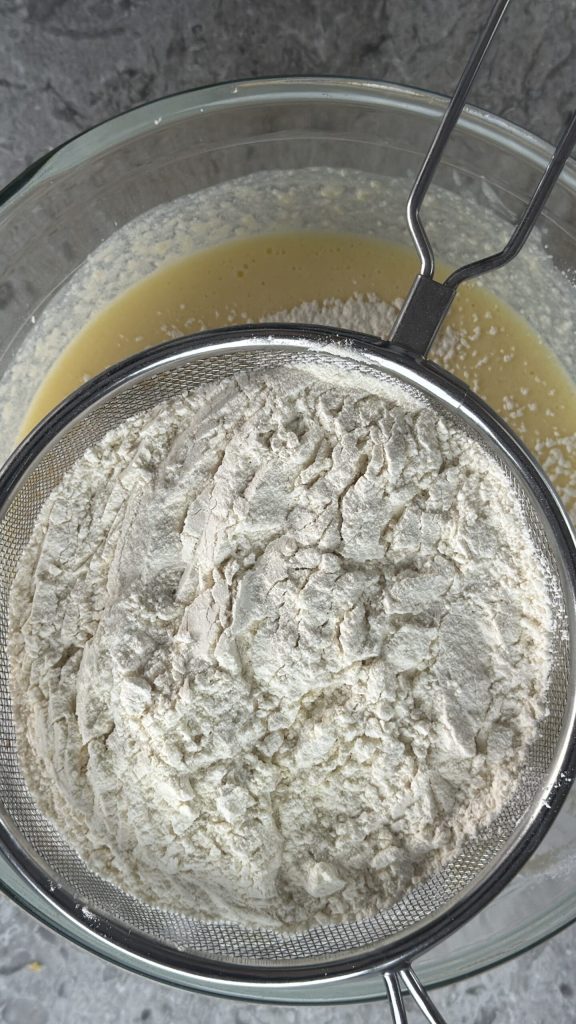 Siebe das Mehl Typ 00 und das Backpulver direkt in die Schüssel mit den flüssigen Zutaten.