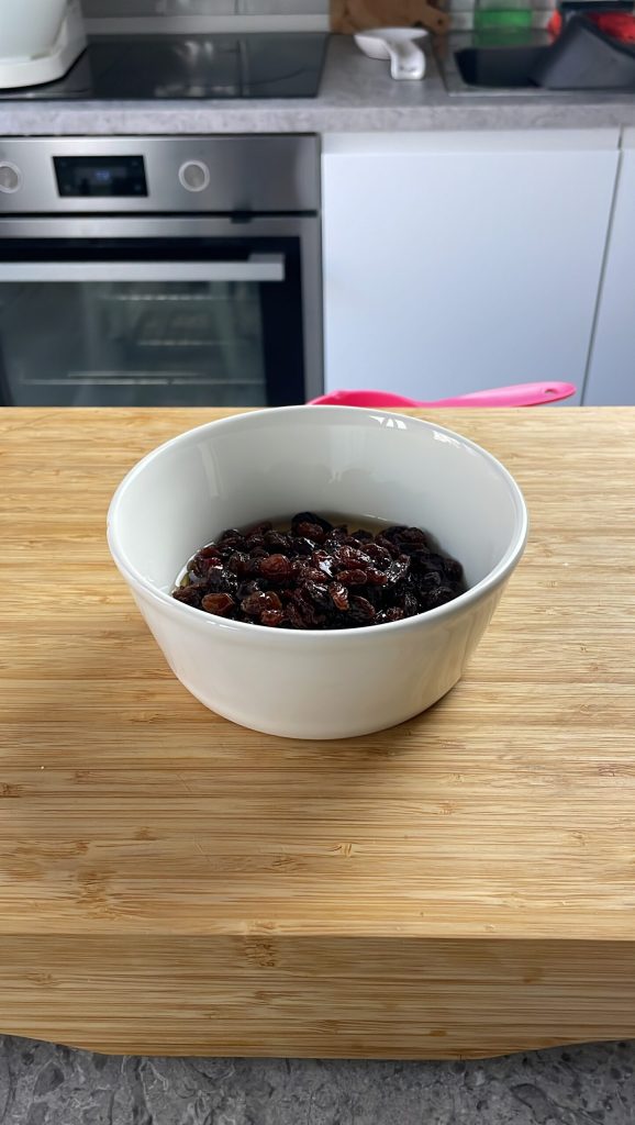 Beginne die Zubereitung der Hot Cross Buns, indem du die Rosinen 30 Minuten in Wasser oder Rum einweichst.