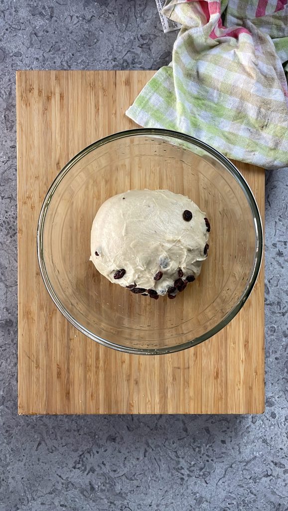 Füge die Rosinen hinzu und knete weitere 5 Minuten.