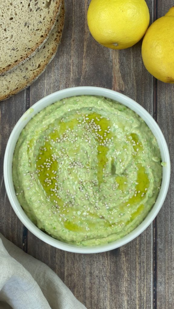Hummus aus Erbsen und Kichererbsen, eine der vielen Varianten des Hummus, der nahöstlichen Creme auf Basis von Kichererbsen und Tahina, einer weißen Sesampaste. Das Rezept ist einfach und schnell und sehr ähnlich dem Original.