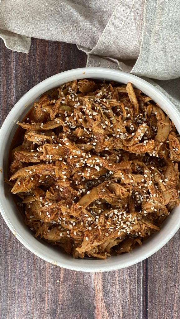 Das in der Slow Cooker marinierte Hähnchen lässt sich mit vielen Beilagen kombinieren: Du kannst es mit Basmatireis als komplettes Hauptgericht servieren, mit in der Pfanne gebratenem Gemüse kombinieren oder zum Füllen von Tacos, Sandwiches und Wraps verwenden. Eine Prise Sesamkörner, wie ich es gemacht habe, verleiht eine knusprige Note, die das Gericht noch einladender macht.