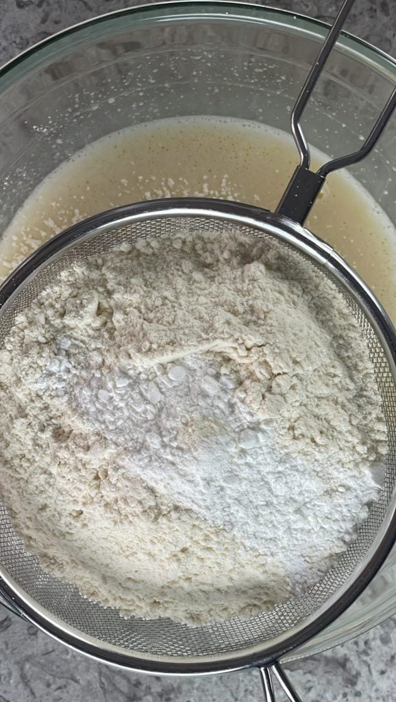 Siebe das Weizenmehl 00 und das Backpulver direkt in die Schüssel mit den flüssigen Zutaten.