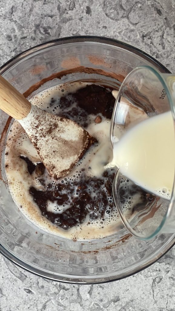 Gieße die Milch langsam unter ständigem Rühren ein.