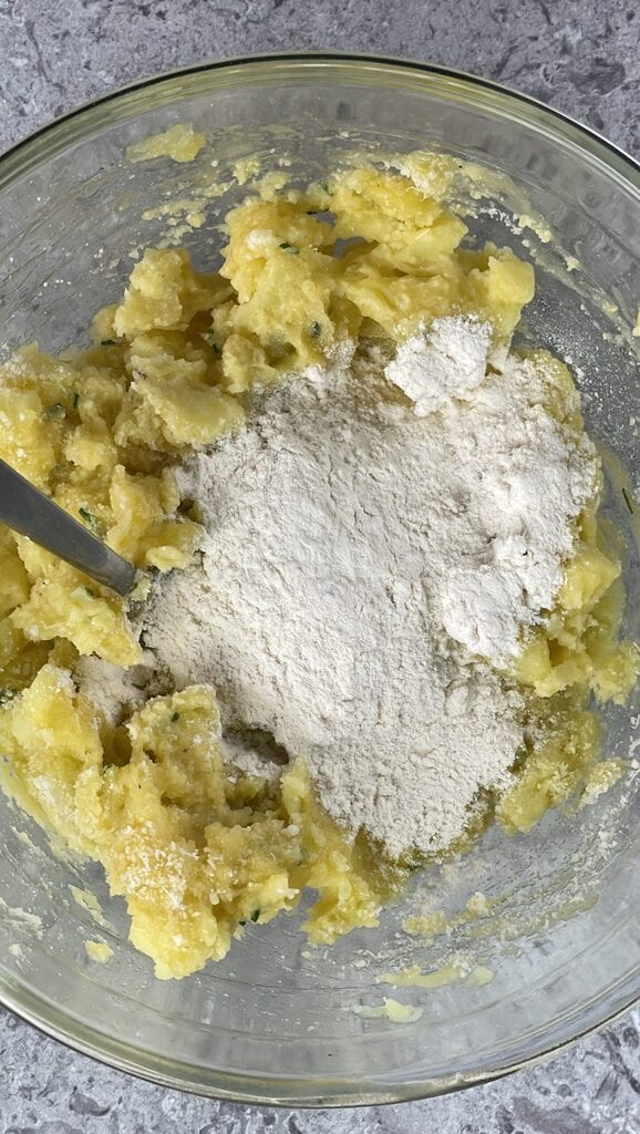 Füge in der Schüssel auch den geriebenen Pecorino Romano und das Mehl 00 hinzu.