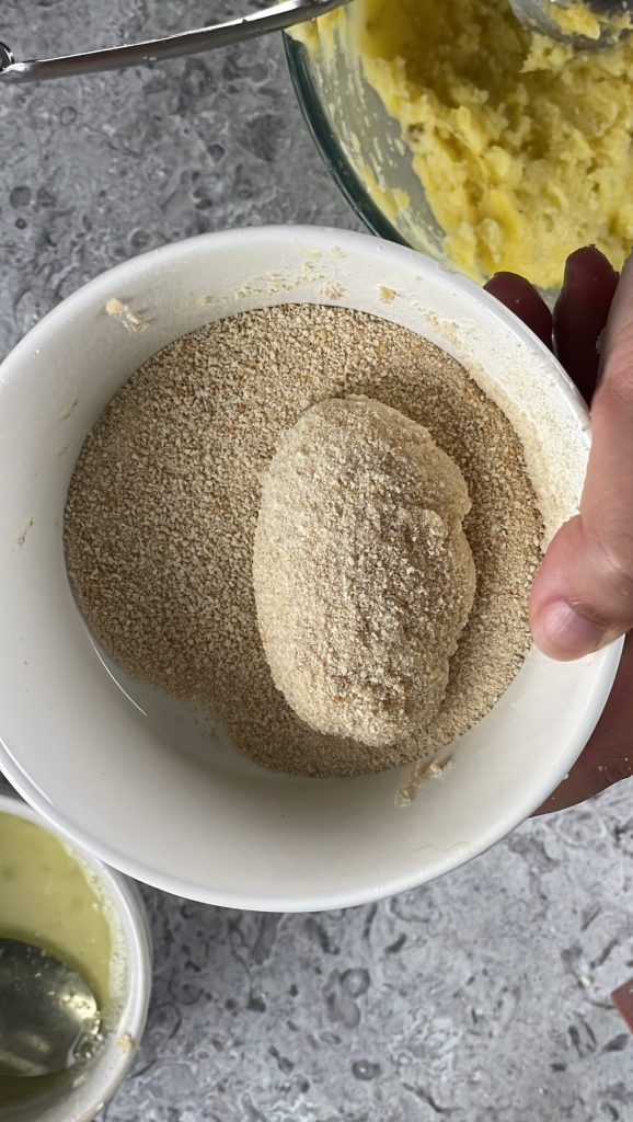 Forme die Kroketten, indem du einen Löffel Teig mit befeuchteten Händen bearbeitest.