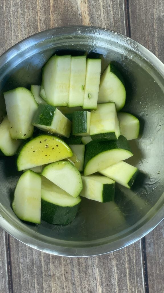 • In der Zwischenzeit wasche und schneide die Zucchini in Stücke.