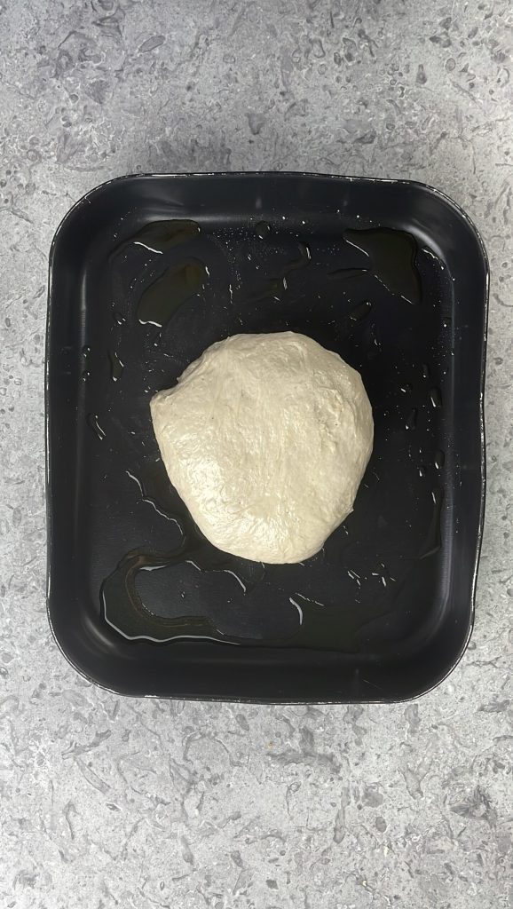 Nimm den gegangenen Teig wieder auf und dehne ihn im Backblech aus, indem du noch etwas Öl hinzufügst.
