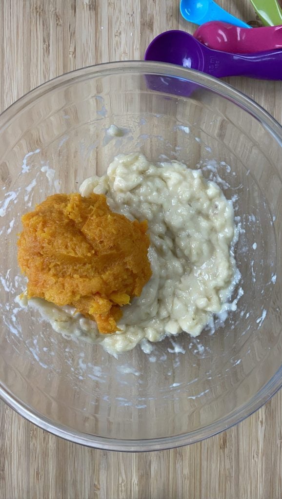 Verarbeite sie mit einer Gabel zu einem Püree.Füge das Kürbisfleisch hinzu, du kannst es fertig kaufen oder Kürbis im Ofen bei 200°C für 40 Minuten oder im Dampfgarer für 20-30 Minuten garen.