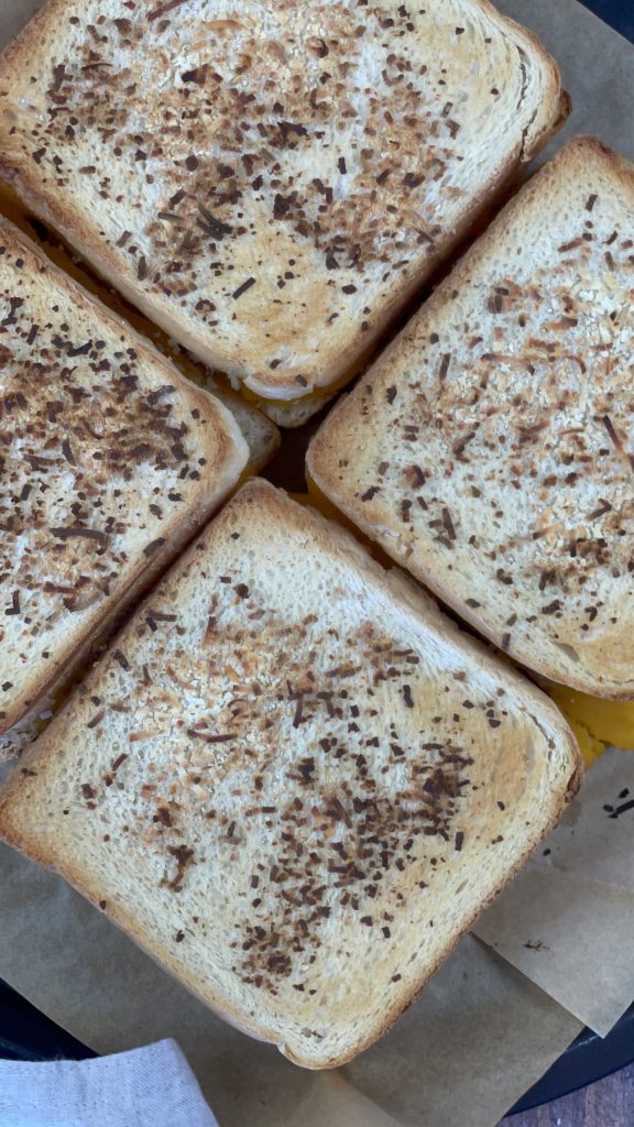 Mit Salz und schwarzem Pfeffer abschmecken und beiseitestellen.Ein Backblech mit Backpapier auslegen und 4 Scheiben Sandwichbrot darauf legen.