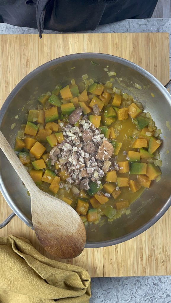 Schwitze sie in einer Pfanne mit zwei Esslöffeln nativem Olivenöl extra und einem Rosmarinzweig an.Schäle den Hokkaidokürbis und entferne die Samen (wirf sie nicht weg, geröstet im Ofen sind sie lecker).