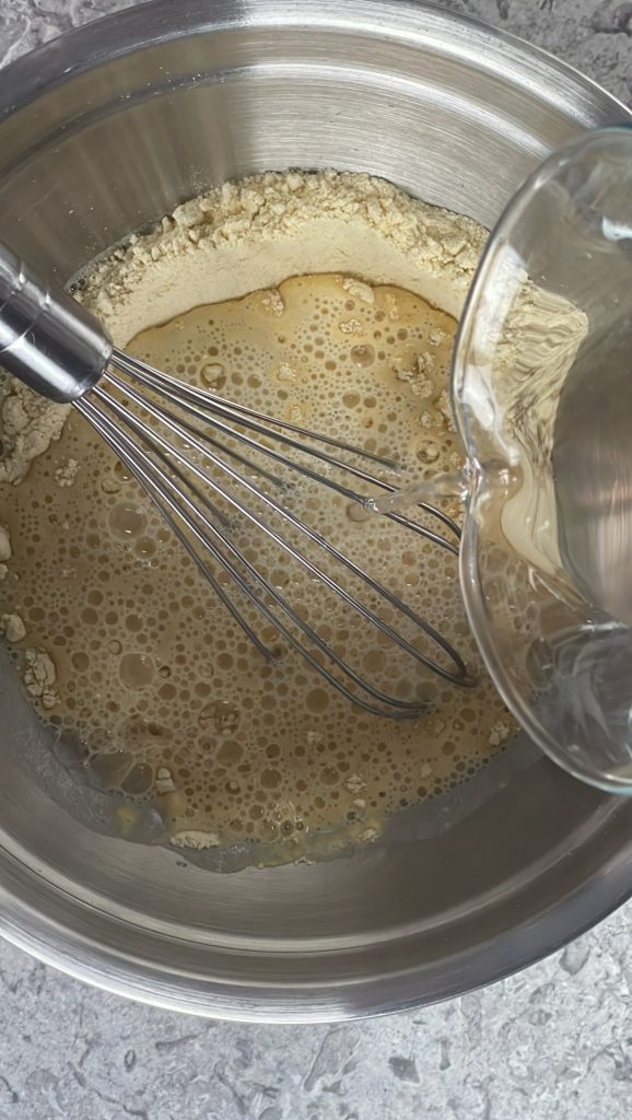 Rühre den Kichererbsenteig wieder um und entferne mit einem Löffel den inzwischen entstandenen Schaum an der Oberfläche.