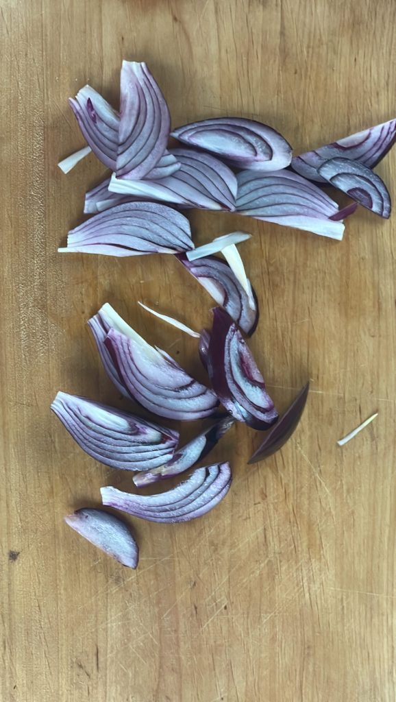 In der Zwischenzeit schäle die rote Zwiebel und schneide sie in dünne Scheiben.