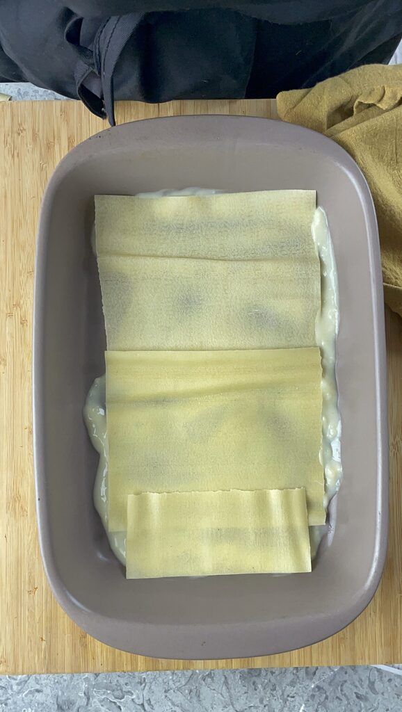 Fahre mit einer Schicht Lasagne fort, wenn du wie ich die dünnen verwendest, ist es nicht nötig, sie vorab zu kochen.