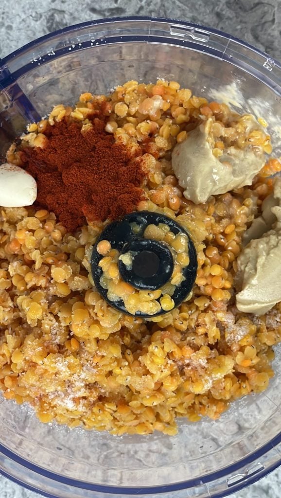 Seiße sie gut ab und lass sie abkühlen.Gib die abgekühlten Linsen in einen Mixer zusammen mit einer Knoblauchzehe, Tahina, dem Saft einer halben Zitrone, Salz und geräuchertem Paprikapulver.