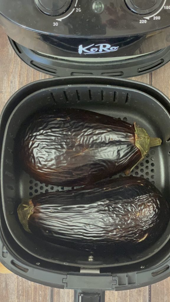 Lege die Auberginen in den Korb der Heißluftfritteuse und backe sie bei 200°C etwa 25-30 Minuten lang.Sobald sie gekocht sind, lege sie in eine Schüssel und lasse sie abkühlen.