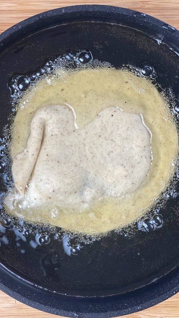 Sie sollte sehr dünn, fast durchsichtig werden.Erhitze in einer Pfanne mit hohen Rändern das Erdnussöl.