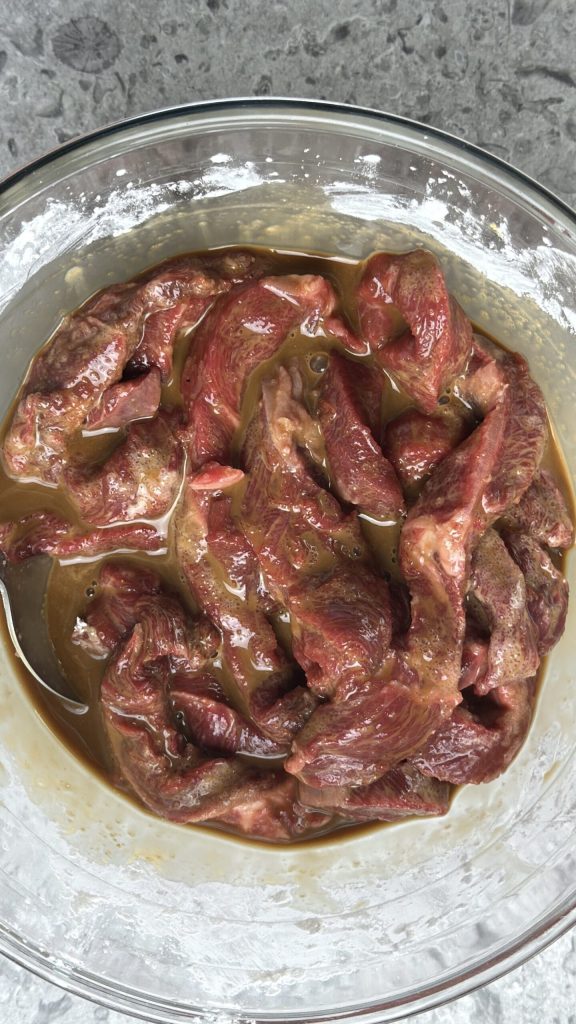 Gib auch die Maisstärke hinzu und mische erneut, diesmal mit mehr Sorgfalt: Alle Rindfleischstreifen sollten mit Stärke bedeckt sein.